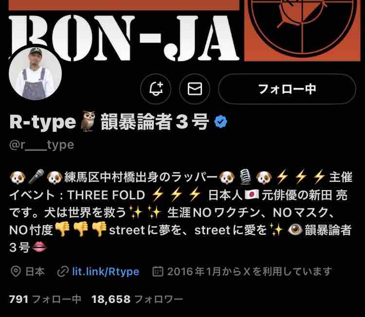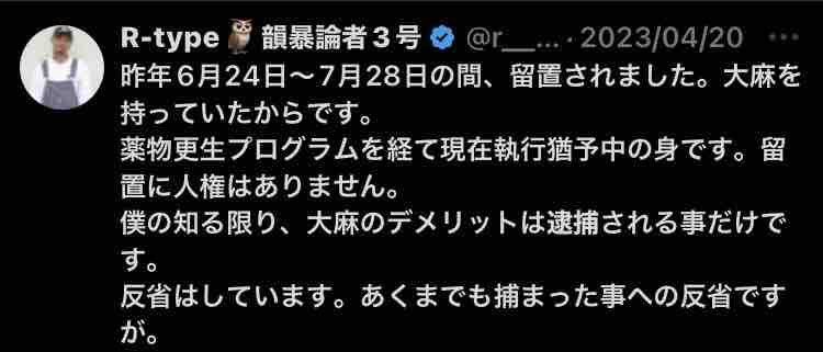 反ワクチン系のラッパーグループ、「韻暴論者」(いんぼうろんしゃ、陰謀論者ではない)のボーカル、 R-typeが逮捕されたとの一報が流れた。