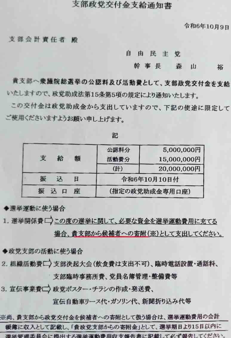 「貴支部から候補者への寄付として…」と書かれているやないか❓