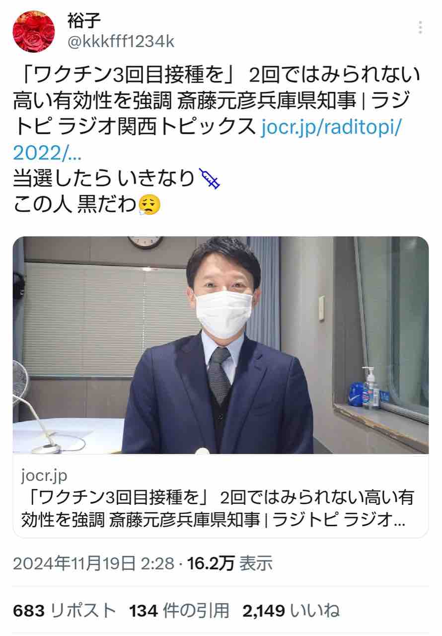 あんた等が勝手に斎藤を持ち上げ、立花の嘘にひっかき回されただけである。彼こそ反ワクには迷惑しており、今後もワクチン推奨を訴える筈であろう。