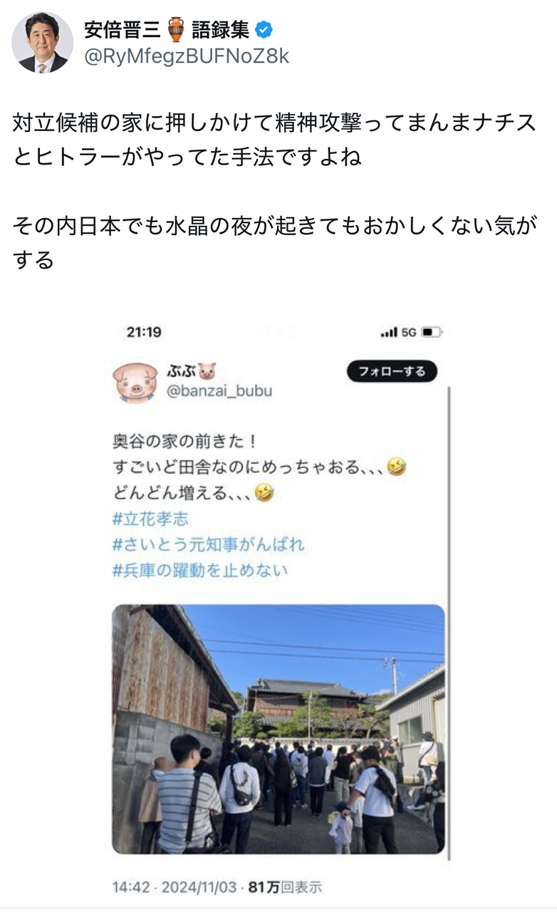 その少し離れた場所。聴衆(齋藤及び立花の支持者)が数十人程度集結。これはトランプの議会占拠と同じく、テロ寸前の状態でありいつ暴徒化してもおかしくない。書いてる人が言ってる通り、令和の日本版「水晶の夜」事件の手前ではなかろうか?