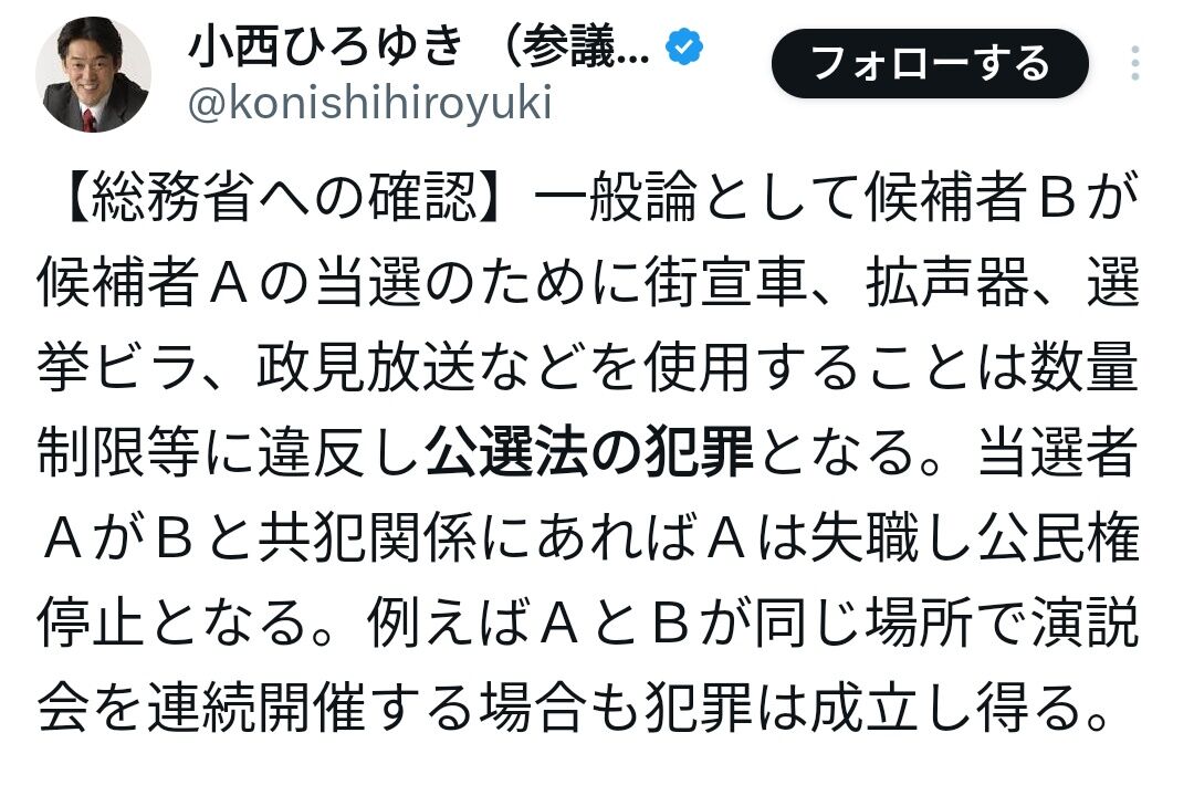 小西博之氏が総務省に確認した内容であり、「候補者Bが候補者Aの応援のため、街宣車、選挙ビラ配り等を行うのは公職選挙法違反」とのことである。つまり今回の県知事選は明らかに違反である。