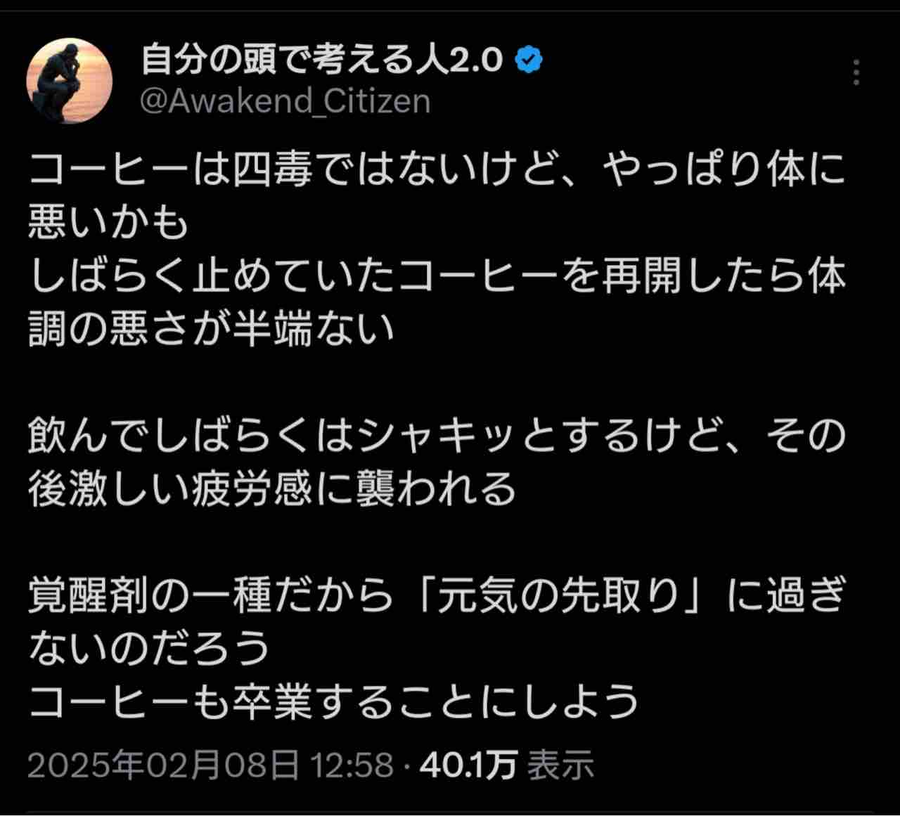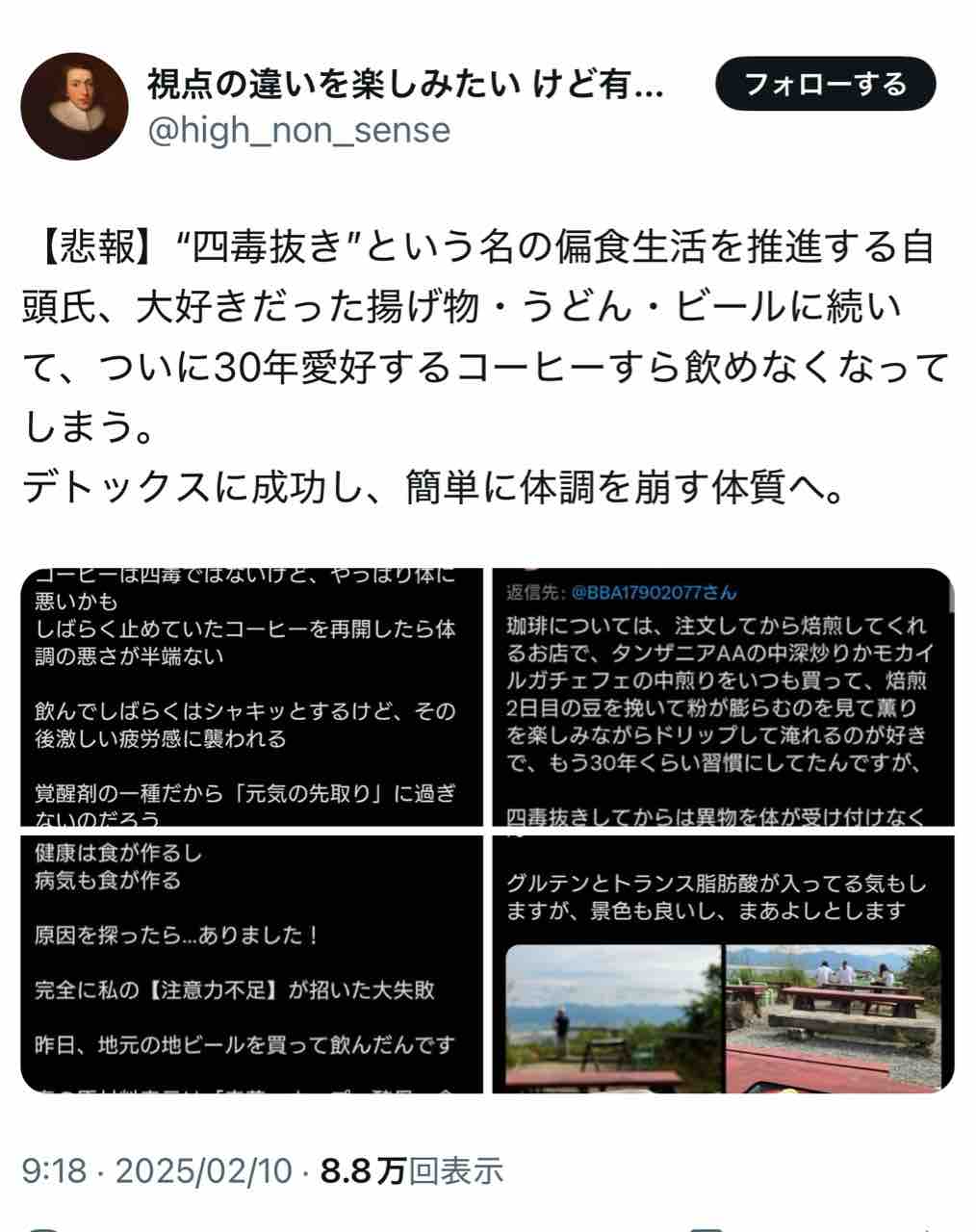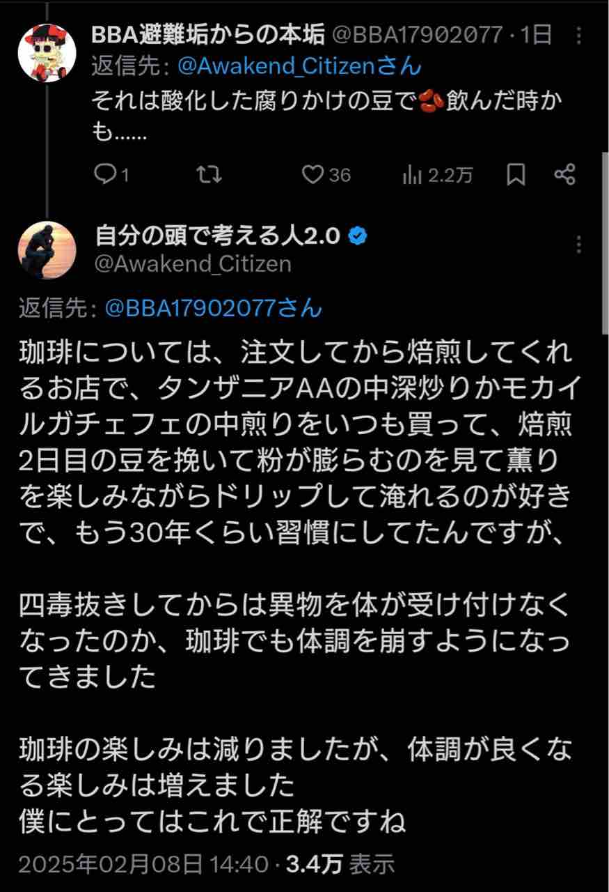 四毒抜きの偏食生活ばかりして、次第に色々なものが飲み食いできなくなった。ついには大好きなコーヒーまで飲めなくなったとさ。