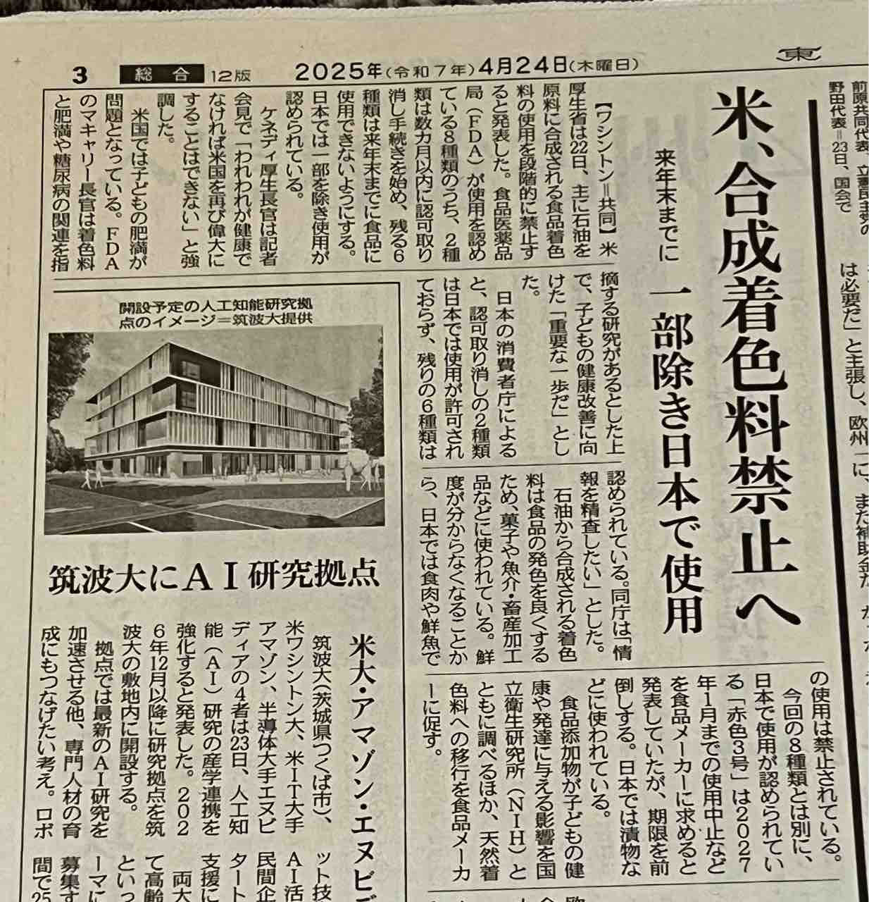 これは米国FDAが、人工着色料について2027年までに段階的に禁止にしていくというもの。着色料それ自体が健康に悪いというわけではないが、見た目が美味しく見えるから、食べ過ぎて肥満が増えるとかいう動機らしい。