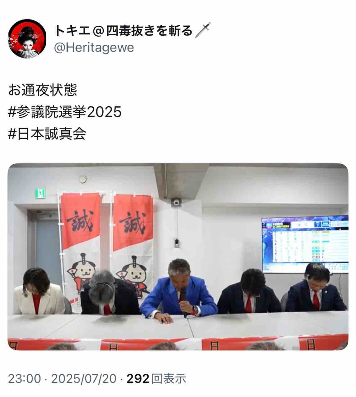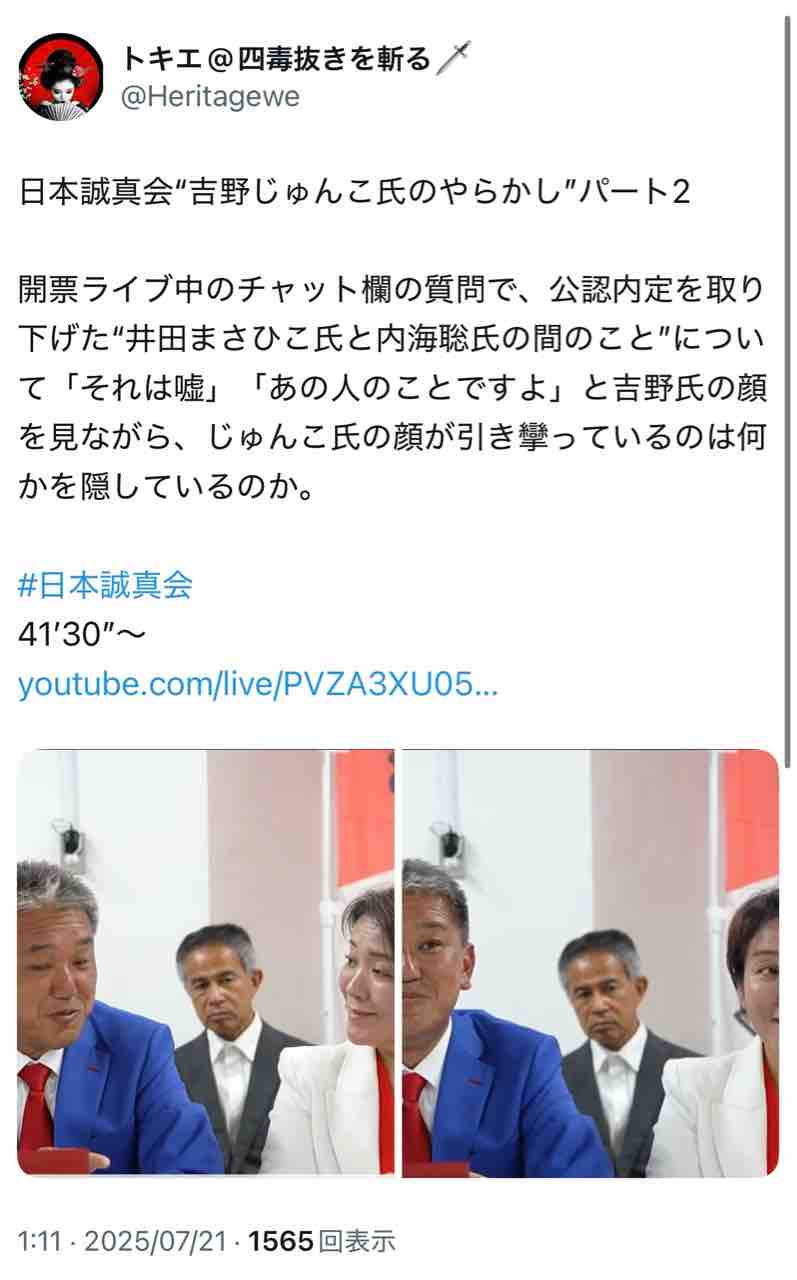 吉野の日本誠真会の開票速報のライブ中、ちょっとしたハプニングがあった。