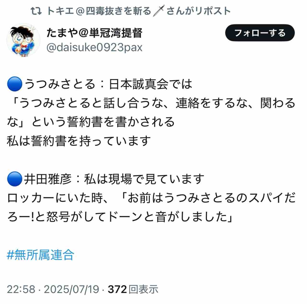 ・井田雅彦氏の体験談。日本誠真会にいた時、ロッカー室で「お前はうつみさとるのスパイだろう❗️」という怒号とドーン❗️という大きな音がした。