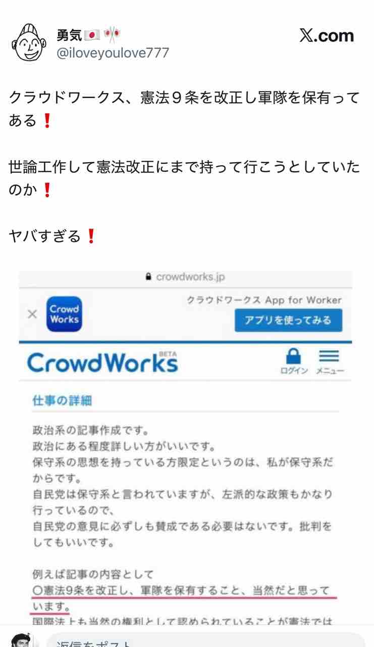 クラウドワークスのニセ世論工作は憲法9条を改正し、「軍隊を持つのを当然」とするまで世論操作するとある。
