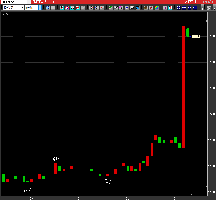 これは寝耳に水のニュースであった。解散観測報道直後の日経先物。このとおり爆上げ状態だ。