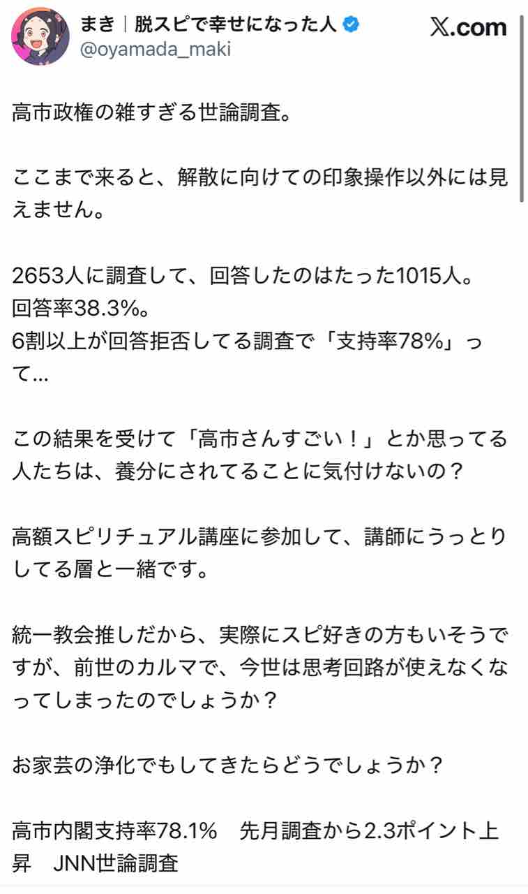 まきさんによると、「この数字だけ見て高市さんすごい❗️と思ってる人は養分にされている。スピチュアル講座に参加し、講師にうっとりしてる層と同じ」だという。